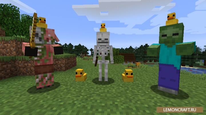 Мод на резиновую уточку Rubber Duck добавит в игру нового, прикольного персонажа, резиновую утку, которая может появится, как на головах зомби, так и на головах скелетов. Так же вы сможете обнаружить ее в сундуках, находящихся в подземелье. Если на уточку нажать, она издаст прикольный звук.